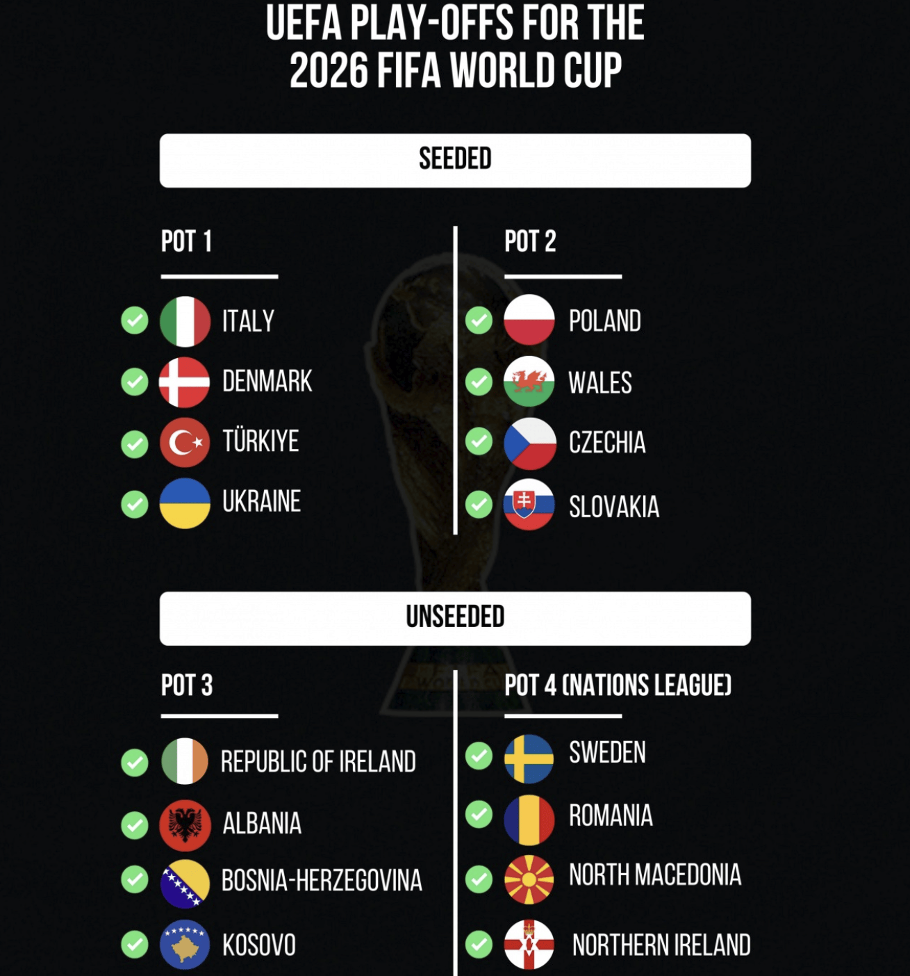 欧洲区12个直接参赛名额全部确定 2026年世界杯还剩9个名额待确定